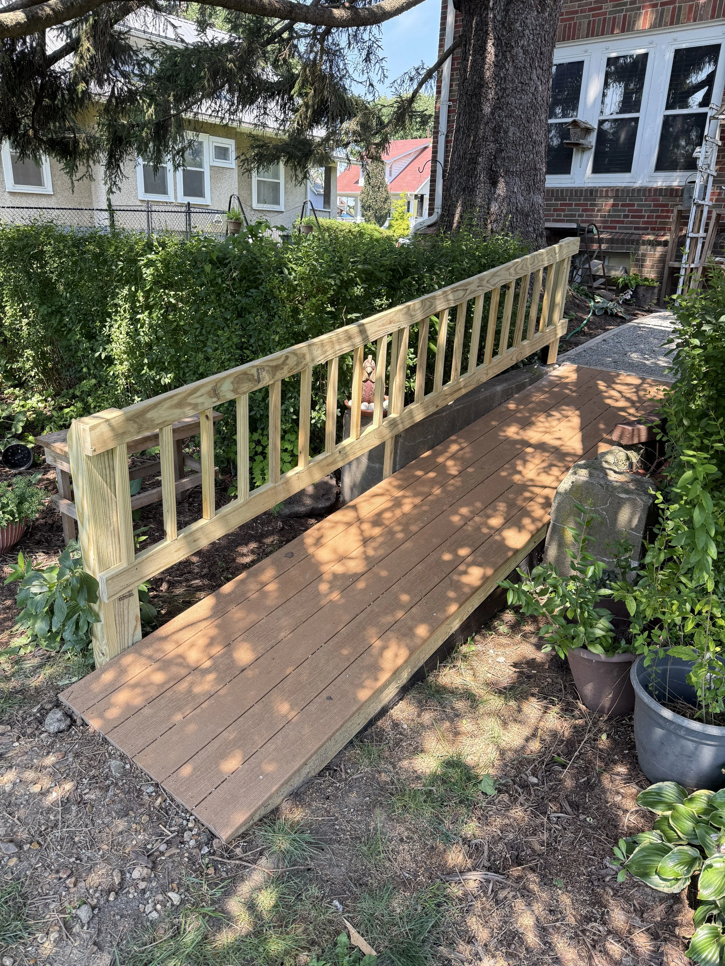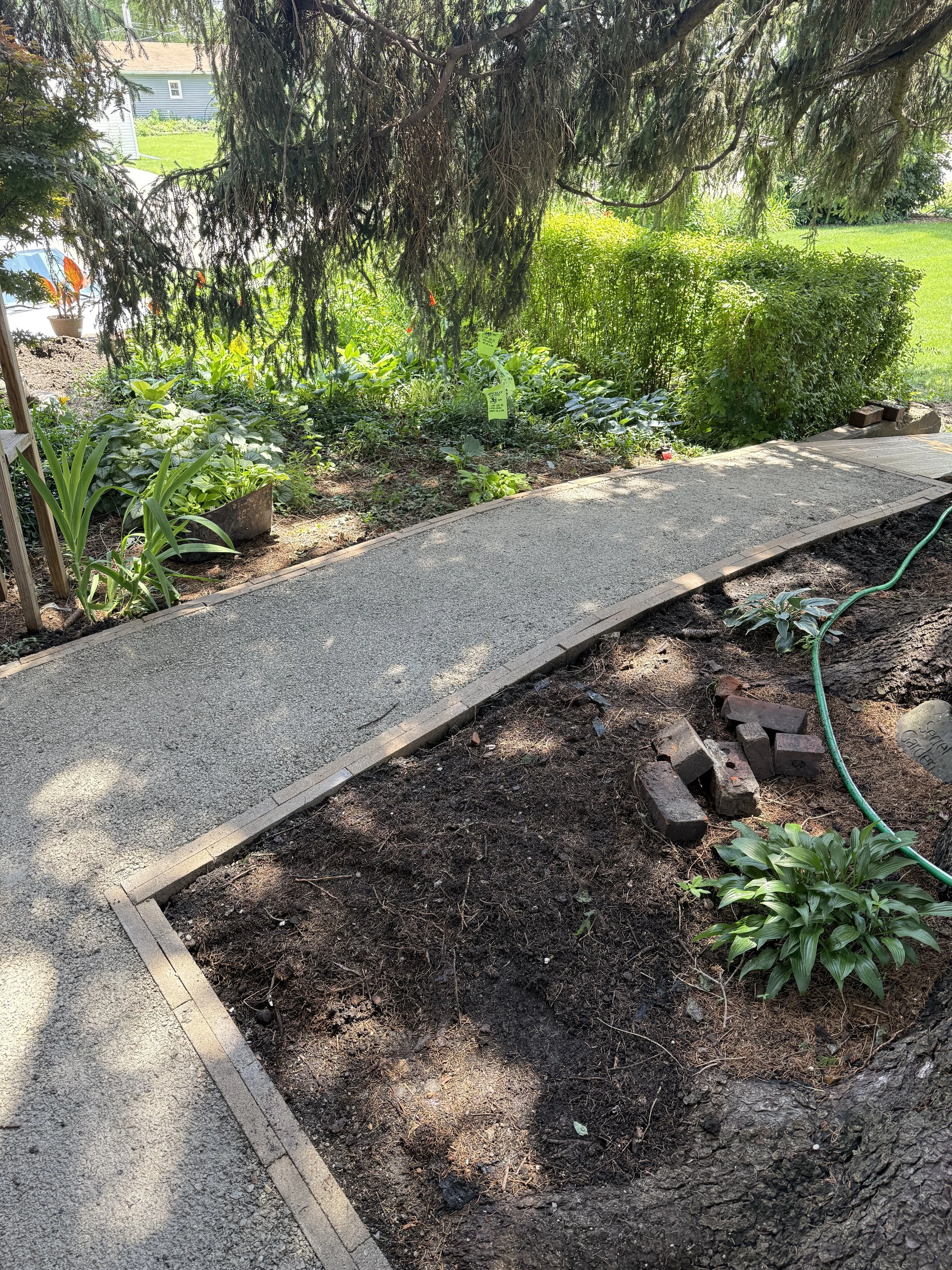 Made with concrete blocks lined up in a running bond holding back a compacted 3/8 chip gravel that was chosen for the large number of roots and shifting over time. we also added a ramp and handrail made from pressure treated 2x4s and composite decking.